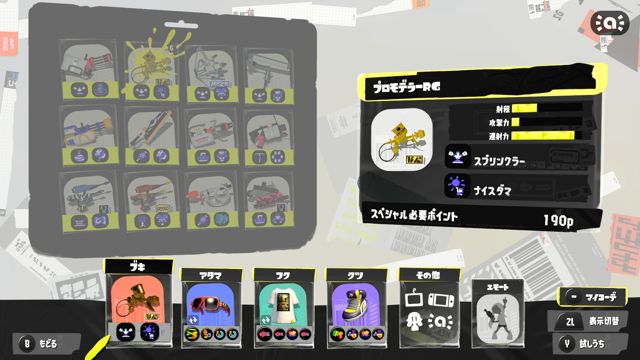 ラストスパート10, イカダッシュ速度アップ16, スペシャル性能アップ10, スペシャル増加量アップ6, 相手インク影響軽減6, サブ影響軽減6, スーパージャンプ時間短縮3,
